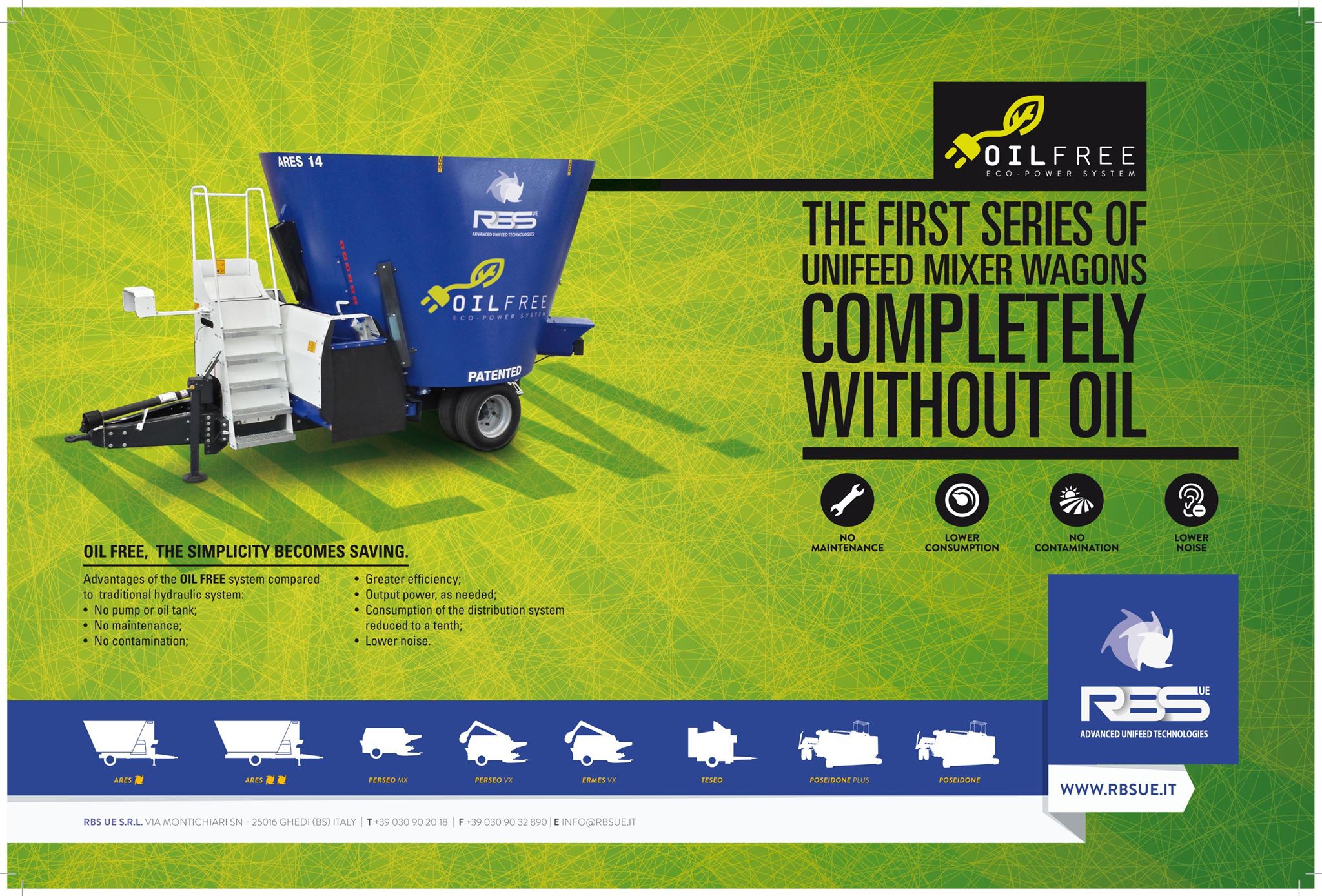 Y cono novedad en España, presentaremos dos máquinas, un UNIFEED HORIZONTAL Y OTRO VERTICAL, con la innovación tecnológica llamada OIL FREE, eliminando totalmente la instalación de manguitos, bombas, aceite, depósito, etc. funcionando solamente con activadores eléctricos; eliminando toda clase de mantenimiento ( manguitos, filtros, depositos, aceites hidraulicos, etc) y siendo mucho mas sostenibles de cara al medio ambiente.